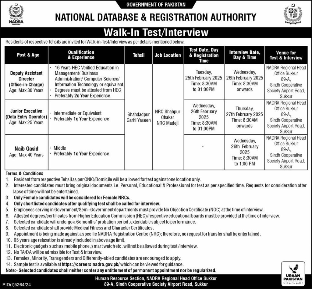 Latest National Database & Registration Authority NADRA Management Posts Sukkur 2025