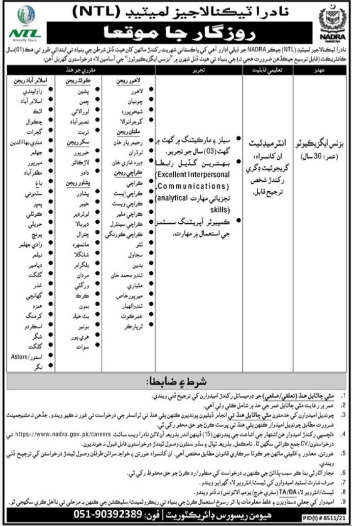 Nadra Technology Limited NTL is looking for candidates for following posts as per job advertisement published in daily Kawish Newspaper of June 6, 2022 for location Karachi, chaman, naseerabad, jhelum valley, neelum valley, loralai, upper dir, skardu, khairpur, chitral, larkana, lahore, lower dir, lahore, dadu, gujrat, gilgit, karachi, sukkur, astore, bagh, gujranwala, mirpur, chakwal, ghizer, muzaffarabad, islamabad, attock, multan, mandi bahauddin, jhelum and peshawar Sindh Pakistan: