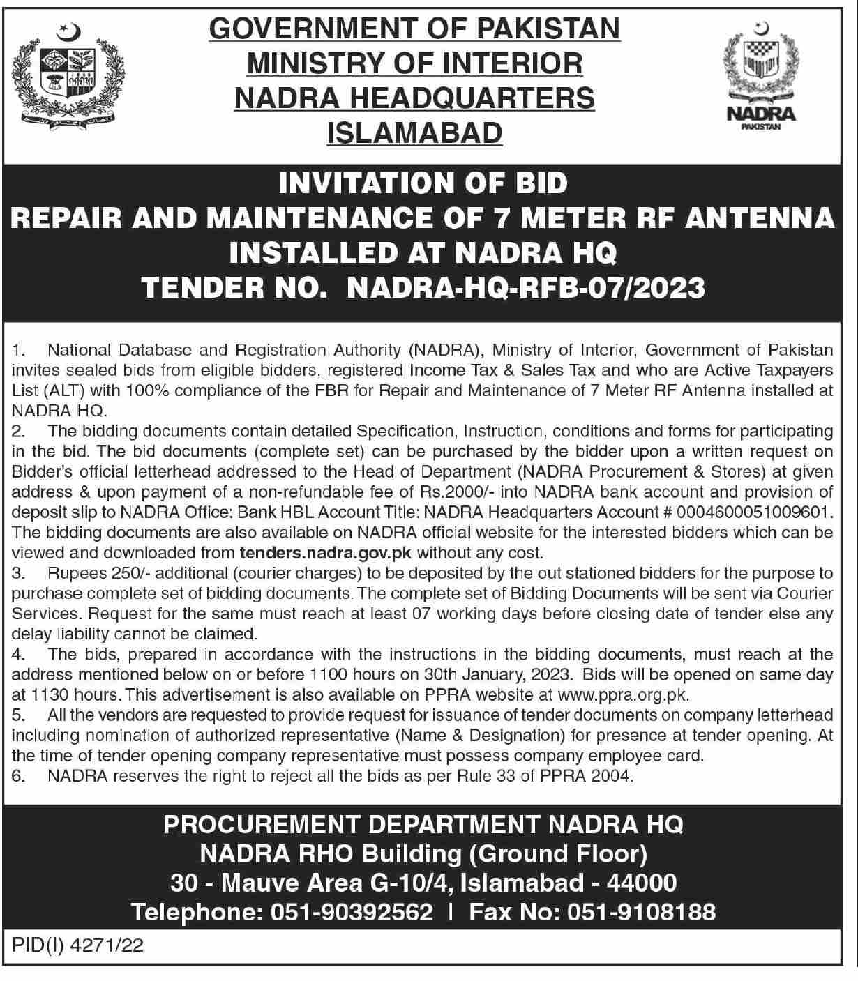 National Database & Registration Authority NADRA latest tenders 2023 for Repair / Maintenance and related tasks are invited as per advertisement in daily Dawn of January 2023 in Islamabad Islamabad Pakistan.