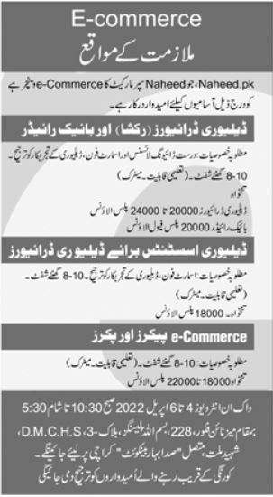 Naheed Super Market NSM Karachi, karachi Sindh Pakistan invites applications from eligible candidates for the post of packer, picker, delivery driver, bike rider and delivery assistant as per advertisement of April 3, 2022 published in daily Jang Newspaper. Preferred Education is Intermediate, Primary, Matric and Middle etc.