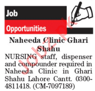 Naheeda Clinic Ghari Shahu Lahore Jobs 2021 for Dispenser