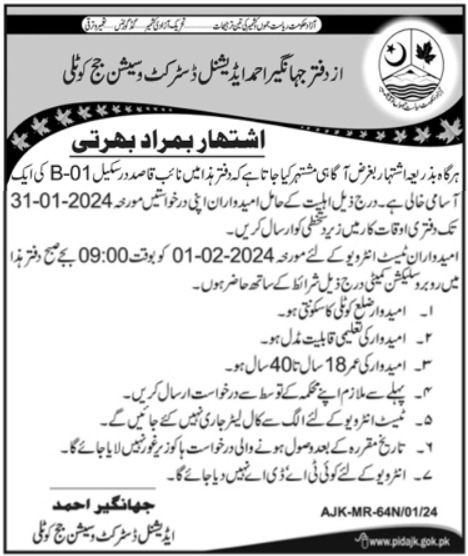 District & Session Judge is looking for candidates for following posts as per job advertisement published in daily Ausaf Newspaper of January 24, 2024 for location Kotli, kotli AJK Pakistan: