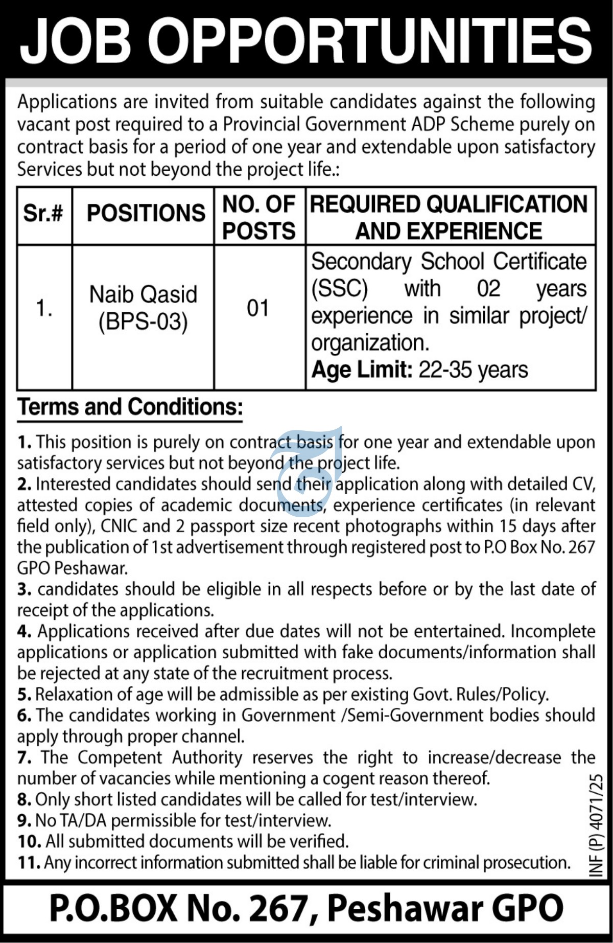 Public Sector Organization invites applications for job positions advertised in daily Aaj dated 27 September 2025 for following vacancies in Peshawar, peshawar Khyber Pakhtunkhwa KPK Pakistan.