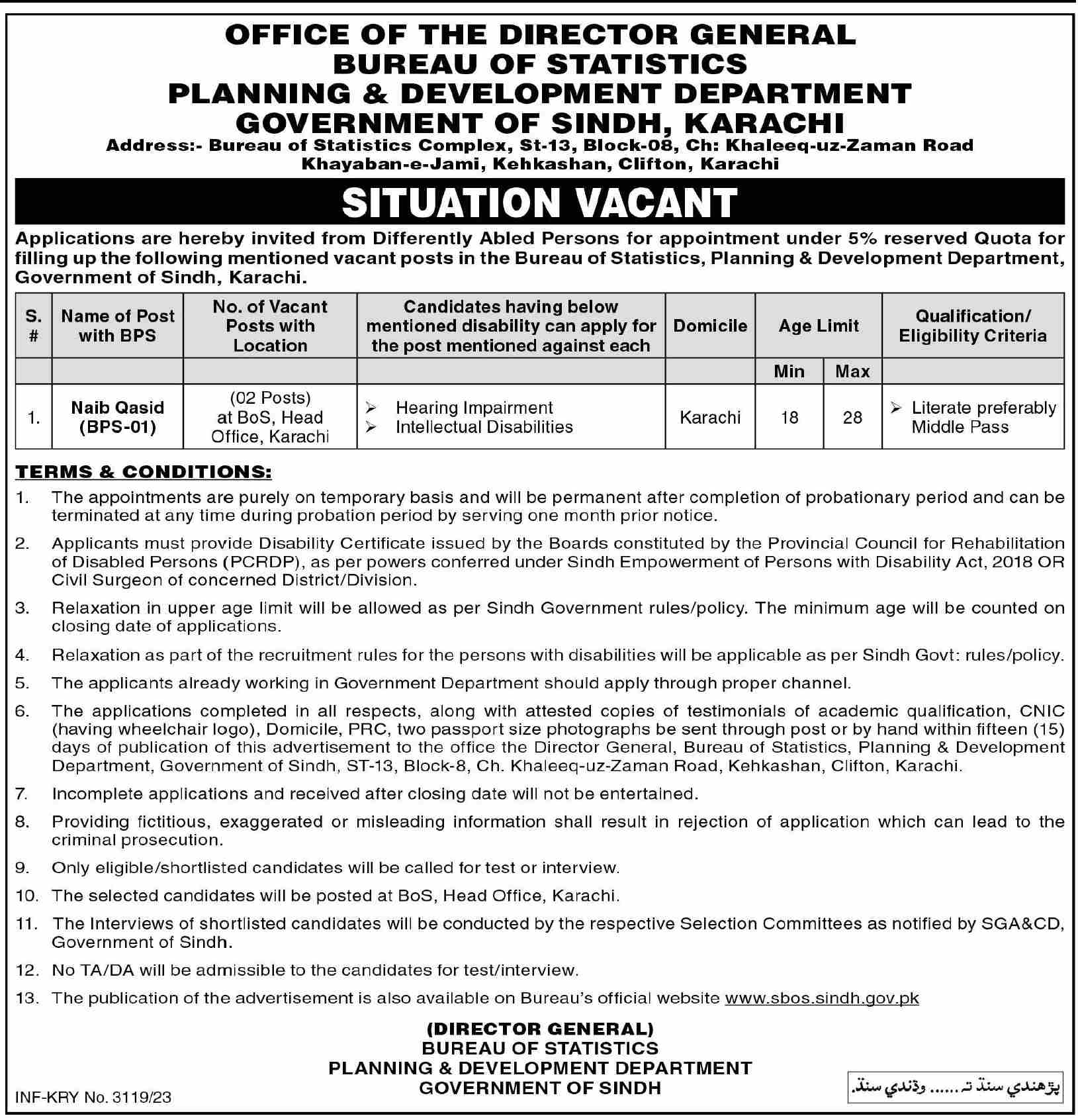 Naib Qasid Jobs At Bureau Of Statistics Sindh