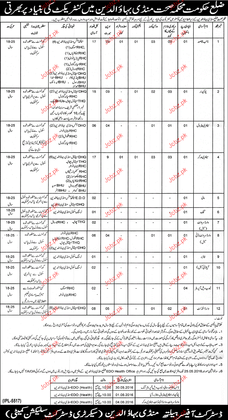 Naib Qasid, Sanitary Petrol, Chawkidars Job in Health Deptt
