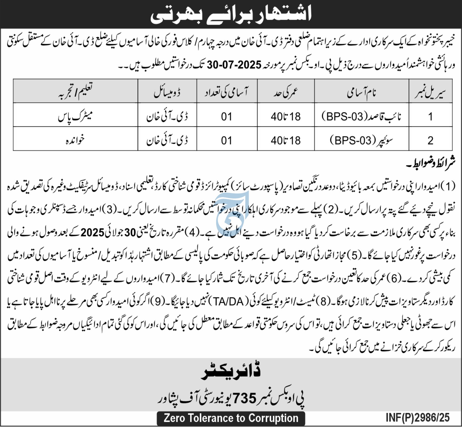 Government Organization invites applications for job positions advertised in daily Aaj dated 12 July 2025 for following vacancies in Peshawar, peshawar Khyber Pakhtunkhwa KPK Pakistan.