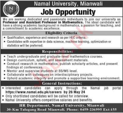 Vacancies in Namal University Mianwali Advertisement May 2024