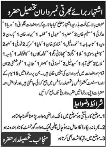 Assistant Commissioner Office jobs advertisement dated about 27 March 2022 in daily Khabrain Newspaper invites application for the vacant post of nambardar in Hazro, hazro Punjab Pakistan. Candidates with Matric and Intermediate etc. educational background will be preferred.