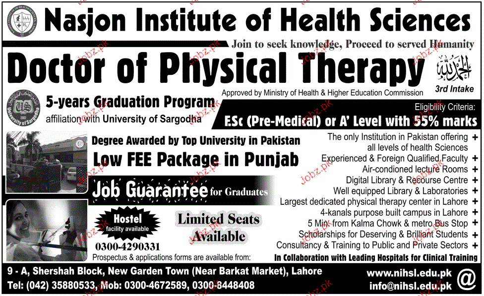 Nasjon Institute of Health Sciences Admission in DPT in Lahore. Read newspaper ad for exact details.