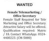 Private Company Lahore, lahore Punjab Pakistan invites applications from eligible candidates for the post of telemarketing officer, office secretary and secretary as per advertisement of November 25, 2024 published in daily Nation Newspaper. Candidates with Bachelor, BA and Intermediate etc. educational background will be preferred.