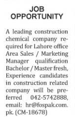 Construction Company Lahore, lahore Punjab Pakistan invites applications from eligible candidates for the post of area sales manager and marketing manager as per advertisement of January 29, 2024 published in daily Nation Newspaper. Preferred Education is BA, Bachelor, MA and Master etc.