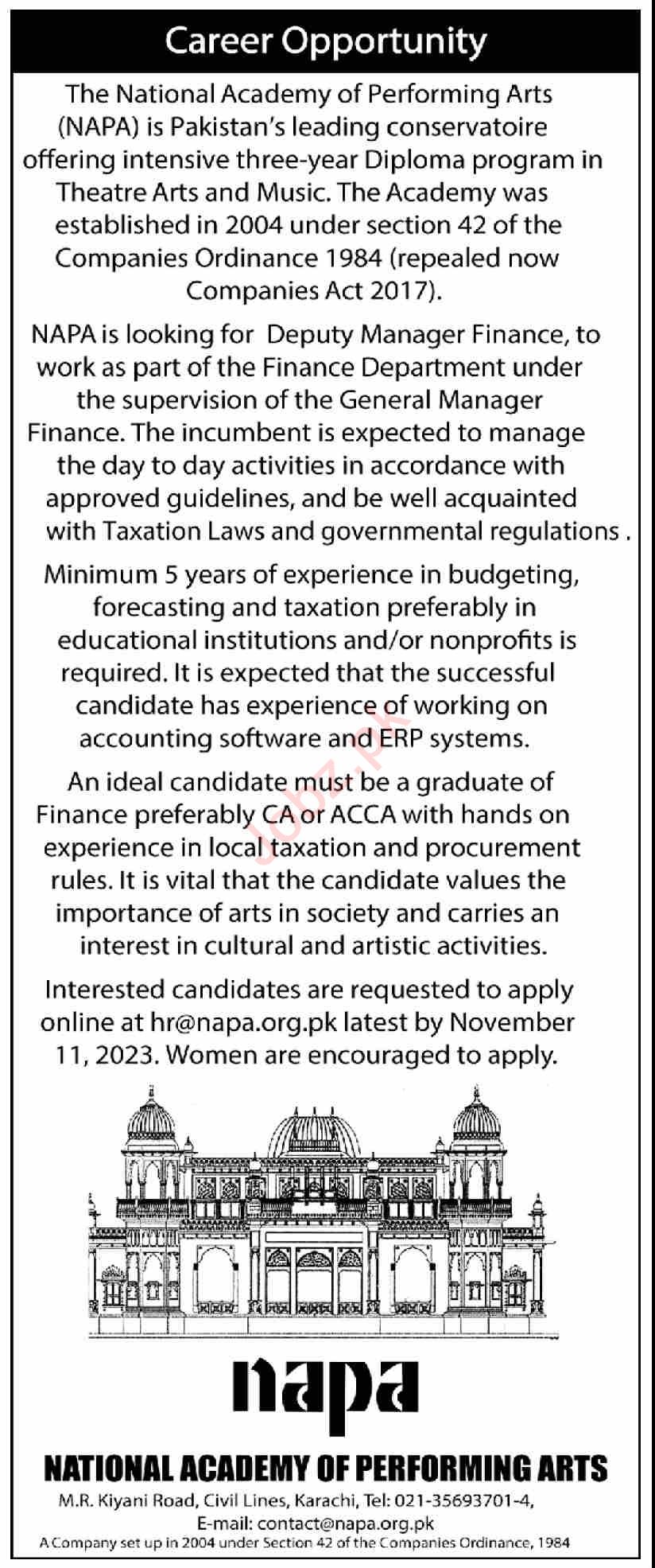 National Academy of Performing Arts NAPA jobs advertisement dated about 29 October 2023 in daily Dawn Newspaper invites application for the vacant post of deputy manager and deputy manager finance in Karachi, karachi Sindh Pakistan. Bachelor, Master and MS etc. educational qualification will be preferred.