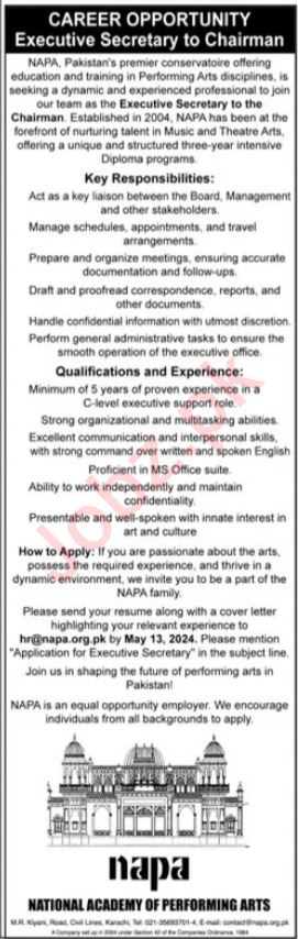 National Academy of Performing Arts NAPA invites applications for job positions advertised in daily Jang dated 28 April 2024 for following vacancies in Karachi, karachi Sindh Pakistan.
