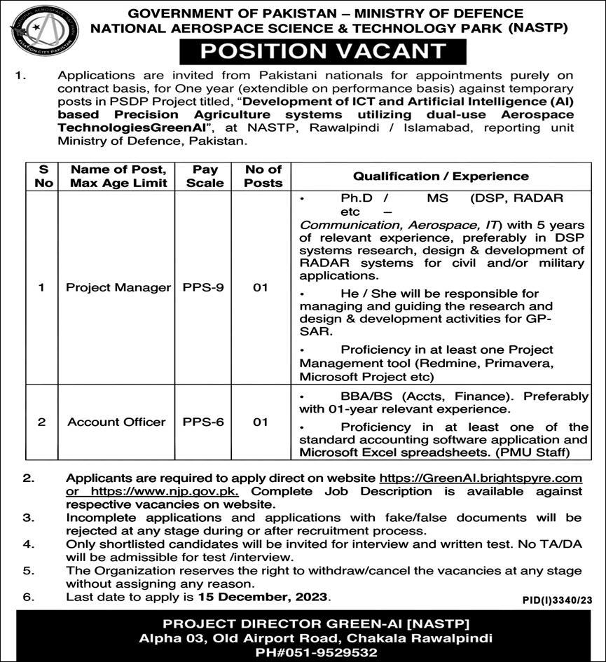 National Aerospace Science & Technology Park NASTP, Ministry of Defence jobs advertisement dated about 2 December 2023 in daily Express Newspaper invites application for the vacant post of account officer and project manager in Islamabad, rawalpindi Islamabad Pakistan. Preferred Education is MS, BBA and Phd etc.