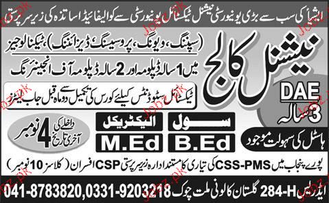 National College Admission in DAE , B.ed and M.Ed in Faisalabad Read newspaper ad for exact details.