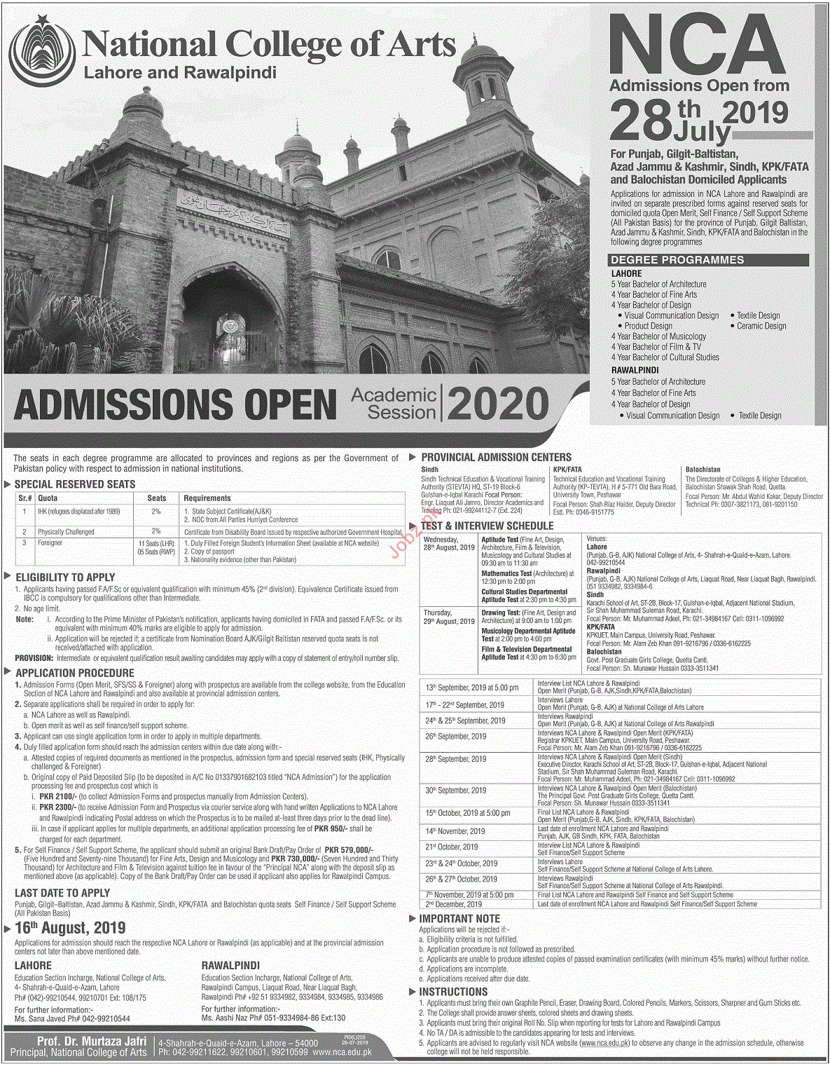 National College of Arts NCA Rawalpindi, Pakistan are starting admissions fall 2019 for the classes of Bachelor in Fine Arts, Design, Film & TV, Cultural Studies and Communication Design. Read newspaper ad for exact details.