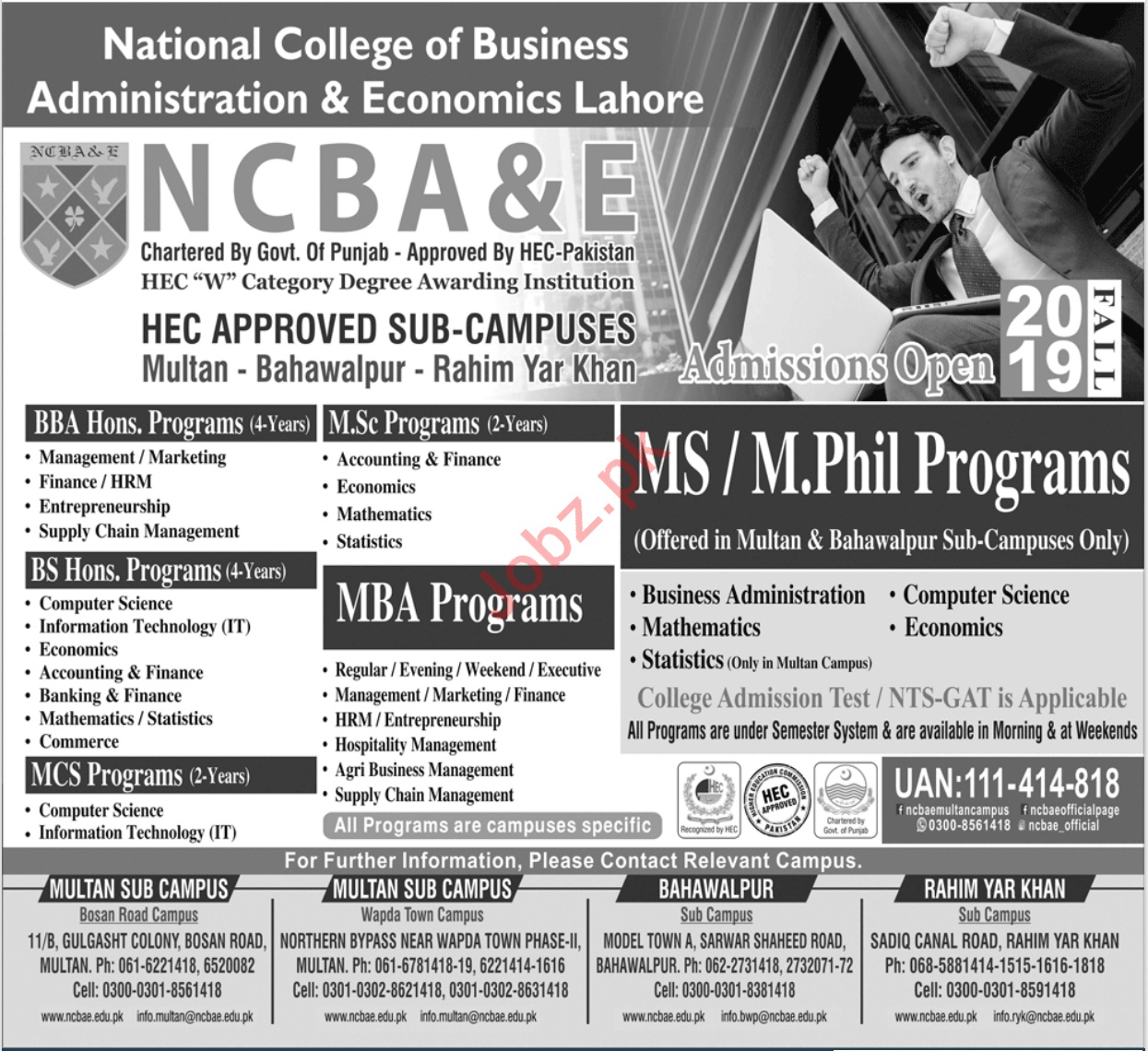 National College of Business Administration & Economics NCBA&E has announced admissions in BBA, BS Computer Science, Information Technology IT, Economics, Accounting and Finance, Banking and Finance, Mathematics, Statistics, Commerce, MCS Computer Science, Information Technology, Accounting and Finance, Economics, Mathematics, Statistics, MS/M.Phil Business Administration, Mathematics, Computer Science, Economics, Statistics in Lahore. Read newspaper ad for exact details.