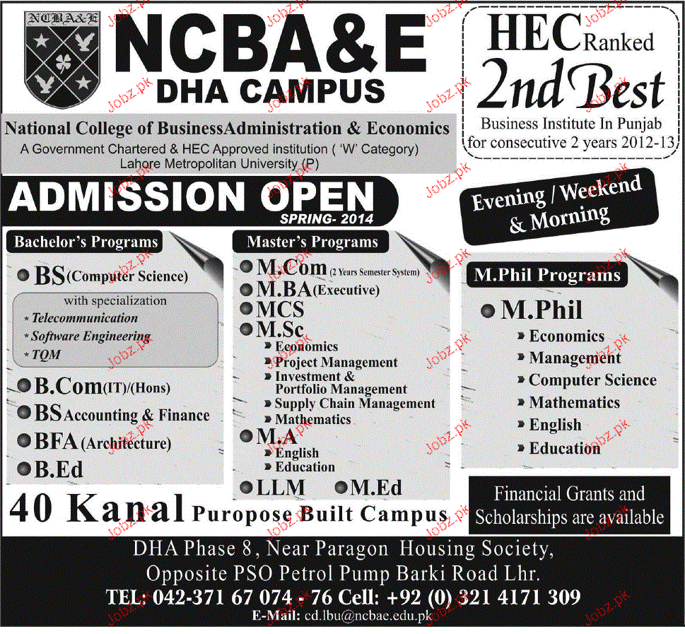 National College of Business Administration & Economics Admission in BS, B.Com, MCom, MCs and Mphill in Lahore Read newspaper ad for exact details.