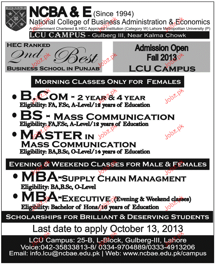 National College of Business Administration & Economics Admission in BCom, BS, MA and MBA in Lahore Read newspaper ad for exact details.