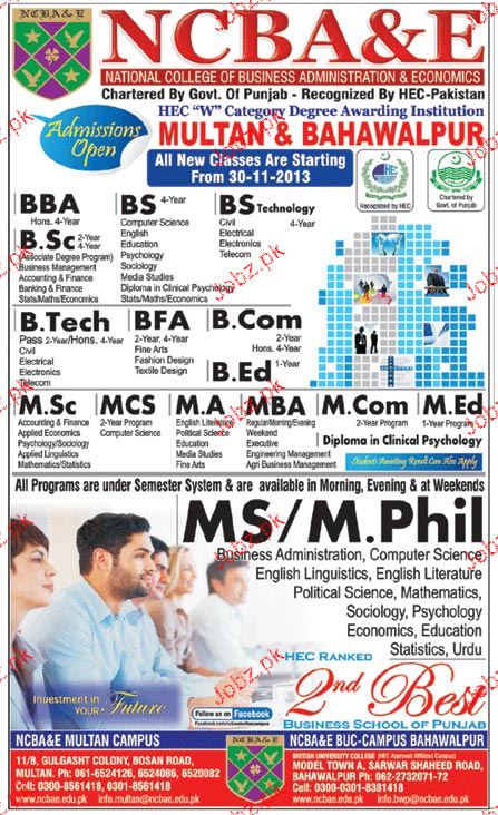 National College of Business Administration & Economics Admission in BBA, BS, BSc, B tech, BFA, BCom, MSc, MBA and M.Ed in Multan Read newspaper ad for exact details.