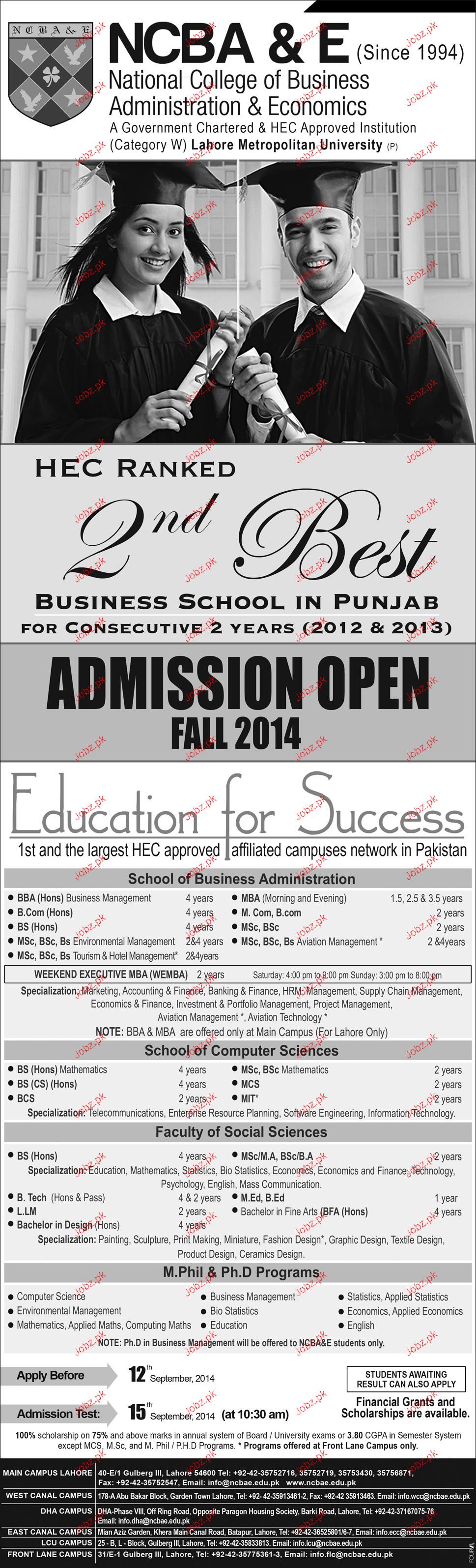 National College of Business Administration & Economics Admission in BBA, B.Com, BS, MSc, MBA, BSc, BA, LLM, Mphill and Phd in Karachi. Read newspaper ad for exact details.