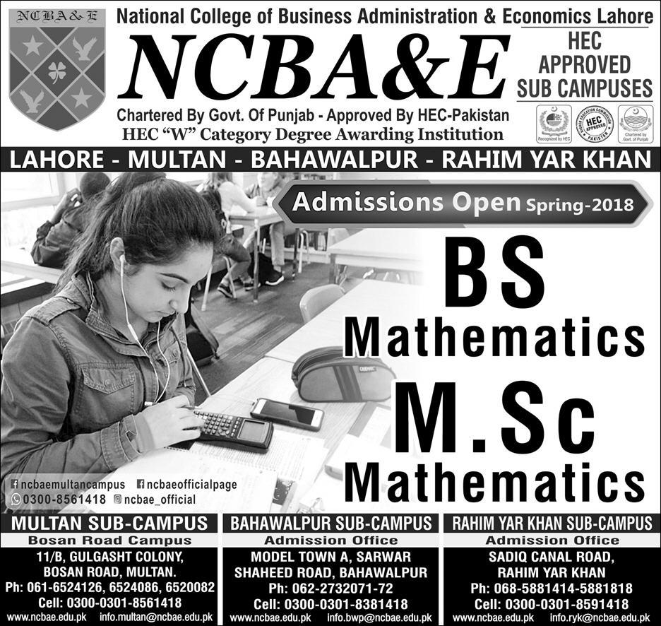 National College of Business Administration & Economics Admission in BS Mathematics and MSc Mathematics in Rahim Yar Khan. HEC Approved Sub Campus. Admission Open Read newspaper ad for exact details.