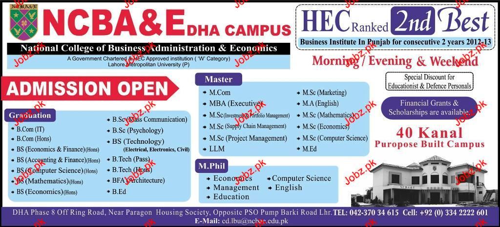 National College of Business Administration and Economics Admission in BCom. BS, BFA, BSc and B.Ed in Lahore Read newspaper ad for exact details.
