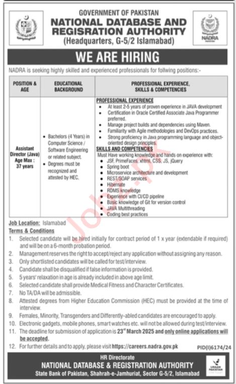 National Database & Registration Authority NADRA is looking for candidates for following posts as per job advertisement published in daily Jang Newspaper of March 10, 2025 for location G-5 Islamabad, islamabad Islamabad Pakistan: