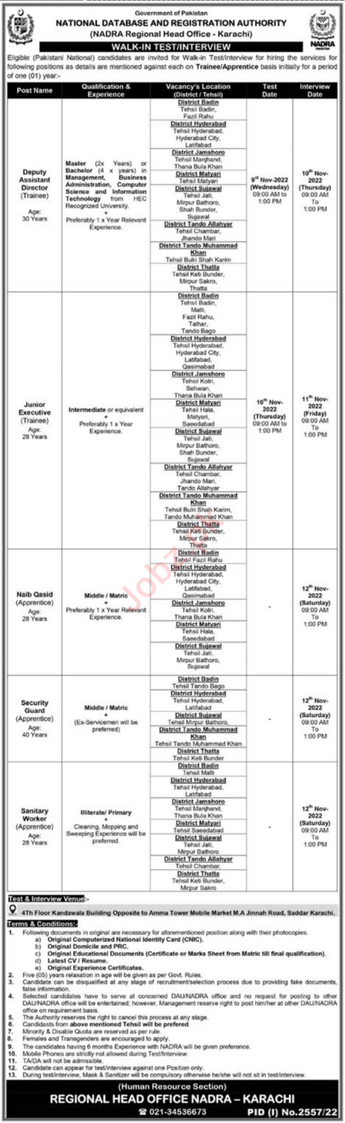 National Database & Registration Authority NADRA jobs advertisement dated about 23 October 2022 in daily Khabrain Newspaper invites application for the vacant post of executive, sanitary worker, security guard, naib qasid and deputy assistant director in Karachi, karachi Sindh Pakistan. Preferred Education is Middle, Master, Intermediate and Bachelor etc.