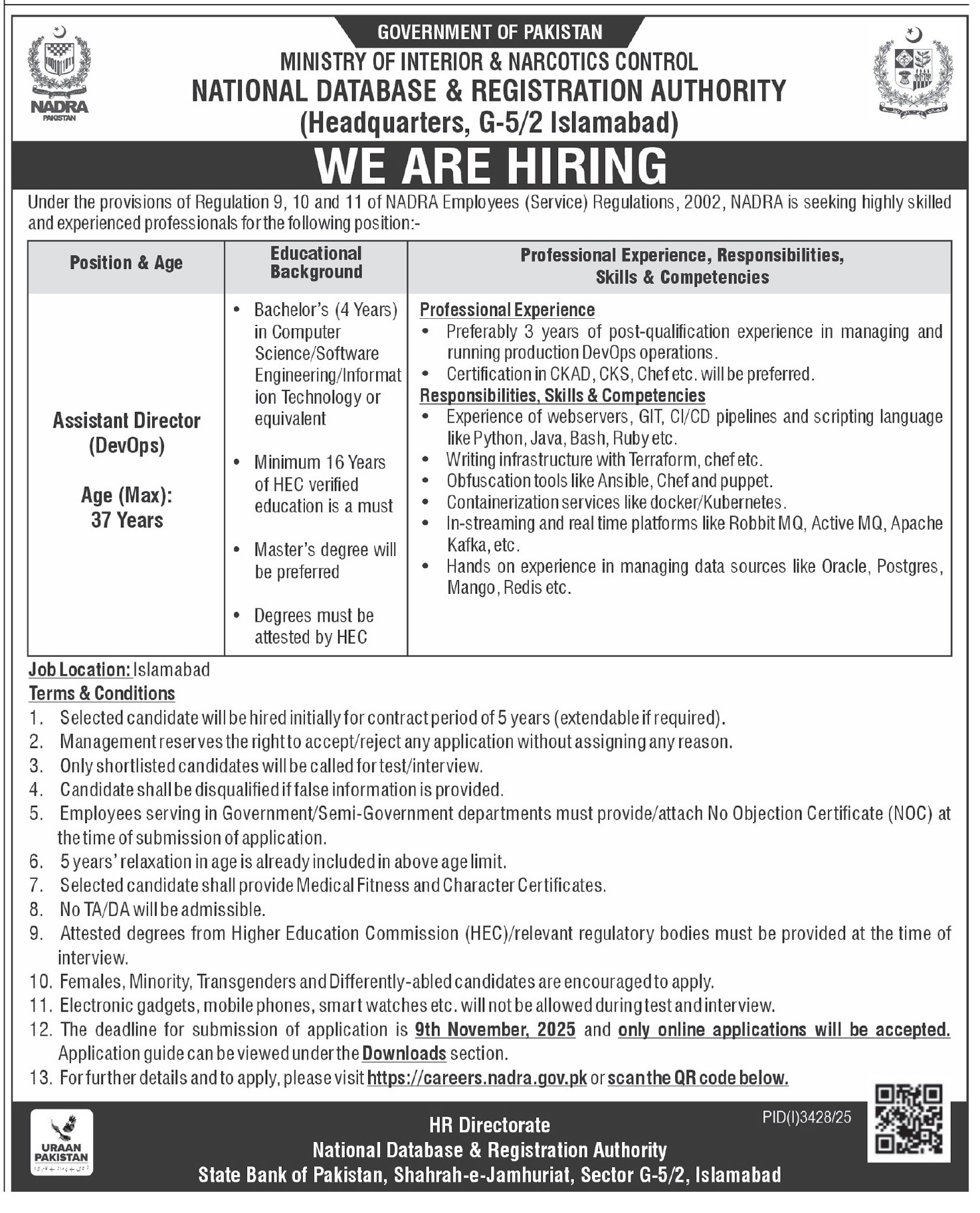 Vacant posts including assistant director are announced in National Database & Registration Authority NADRA G-5 Islamabad, islamabad Islamabad Pakistan as per 27 October 2025 advertisement in daily Express Tribune Newspaper. Persons with MS, Master and Bachelor etc. education can apply.