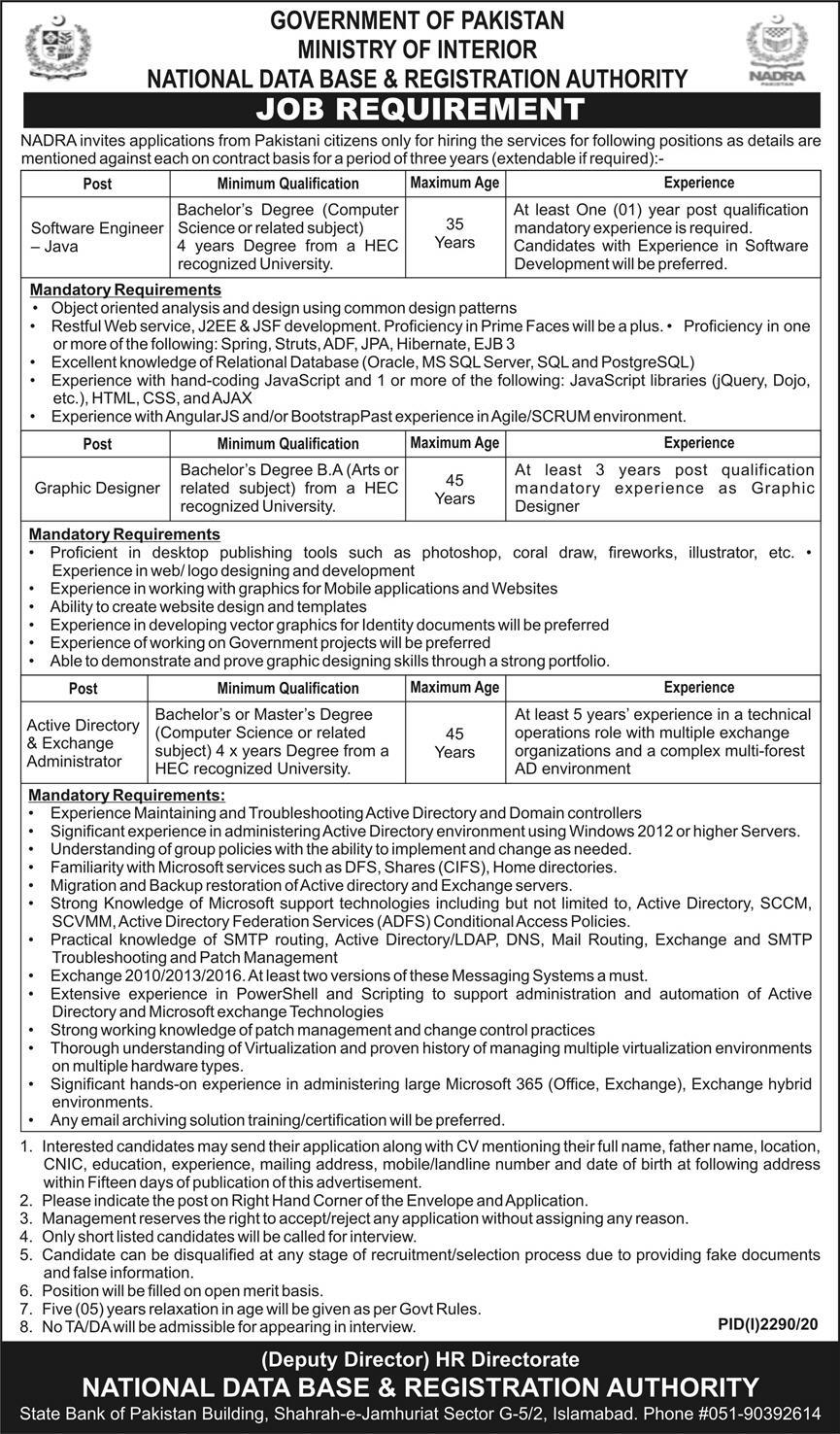 Ministry of Interior Government of Pakistan National Database & Registration Authority NADRA invites applications from experienced and well educated individuals for the posts of Software Engineer Java, Graphic Designer, Active Directory & Exchange Administrator in Islamabad.