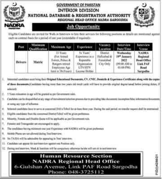 Latest National Database & Registration Authority NADRA Driving Posts Hafizabad 2025