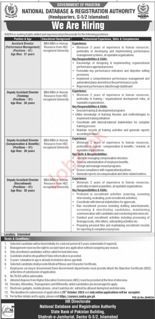 Vacant posts including Deputy Assistant Director Recruitment, Deputy Assistant Director Training, Deputy Assistant Director Compensation Benefits and Assistant Director Performance Management are announced in National Database & Registration Authority NADRA Islamabad, islamabad Islamabad Pakistan as per 14 October 2024 advertisement in daily Jang Newspaper. Persons with Master, MS and Bachelor etc. education can apply.