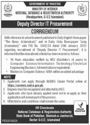 National Database & Registration Authority NADRA is looking for candidates for following posts as per job advertisement published in daily Jang Newspaper of January 31, 2025 for location Islamabad, islamabad Islamabad Pakistan: