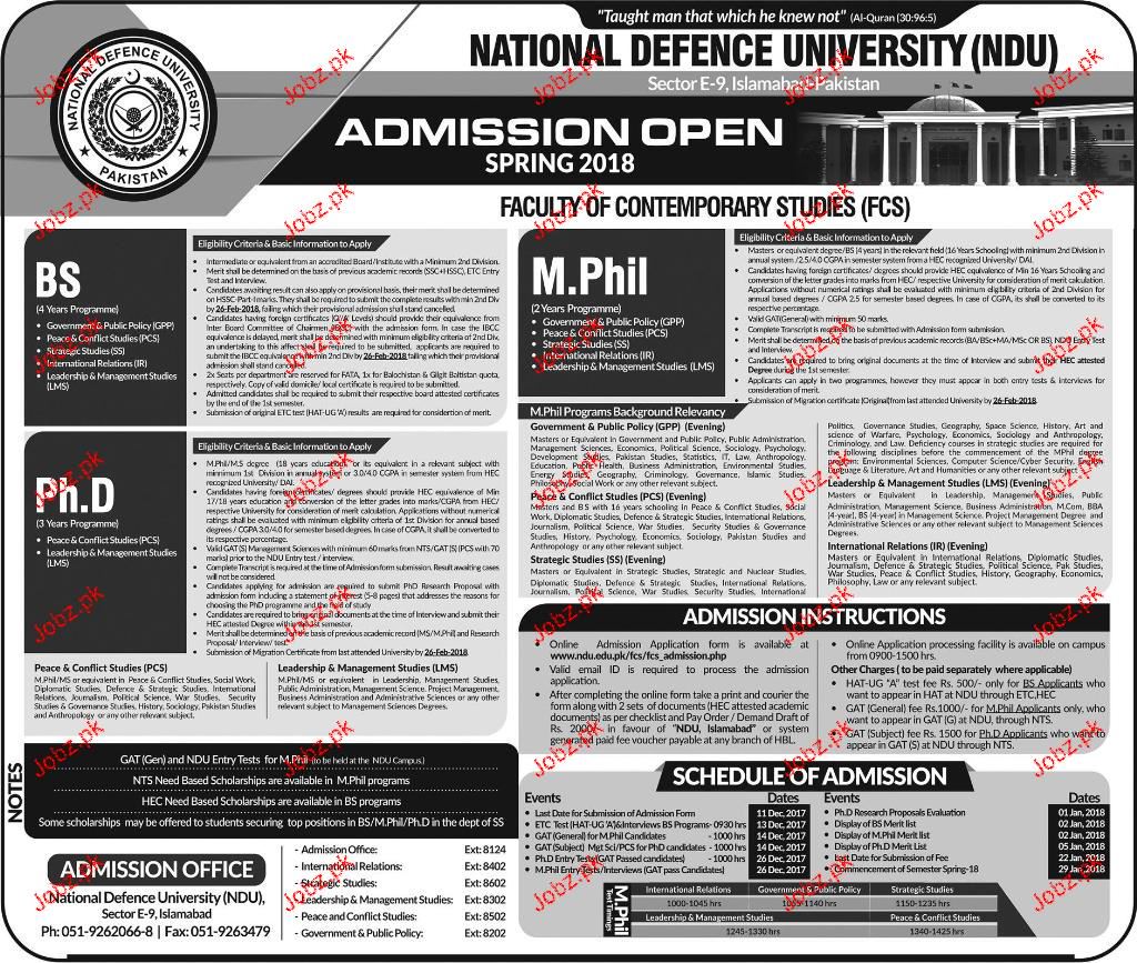National Defence University Islamabad admission in BS Four Year Program, MPhil Two Year Programs and Phd Three Year P4rogram in Islamabad. Last date for submission of admission forms is 11 December 2017. Read newspaper ad for exact details.