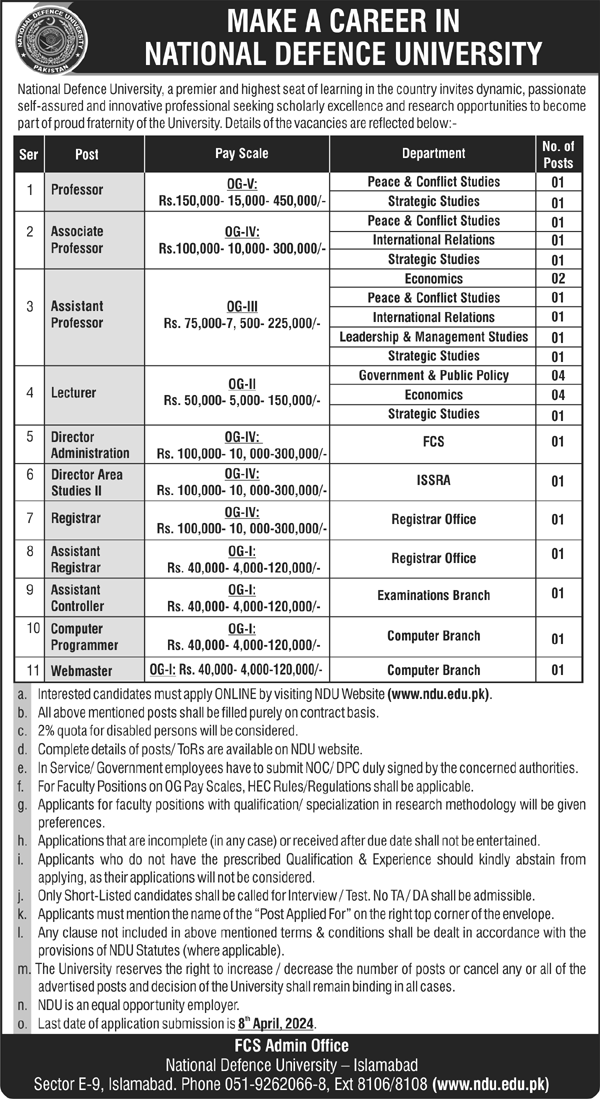 Vacancies in National Defence University NDU Advertisement March 2024