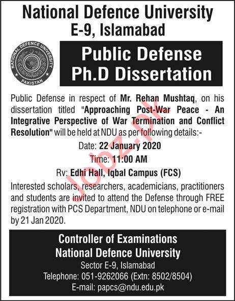 National defence University NDU established by Pakistan Army has announced admissions 2020 for PhD in Public Defense in Islamabad. All Student submit their admissions form before deadline. Read newspaper ad for exact details.