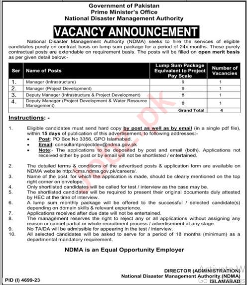 National Disaster Management Authority is looking for candidates for following posts as per job advertisement published in daily Jang Newspaper of February 4, 2024 for location Islamabad, islamabad Islamabad Pakistan: