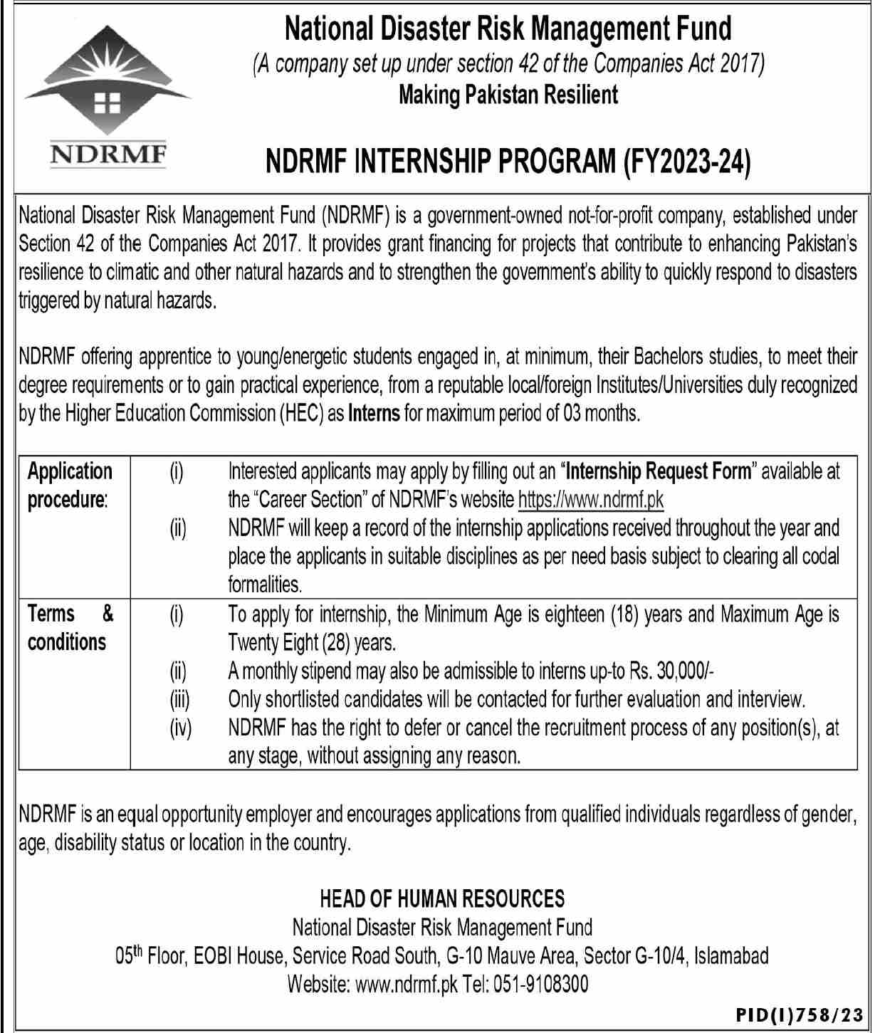 Latest National Disaster Risk Management Fund NDRMF Management Posts Islamabad 2025