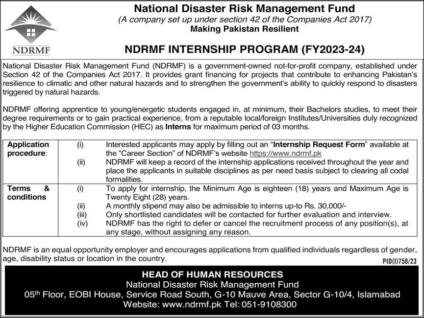 Apply at National Disaster Risk Management Fund NDRMF latest Government jobs Internships in Management and departments before closing date which is around August 22, 2023 or as per closing date in newspaper ad. Read complete ad online to know how to apply on latest National Disaster Risk Management Fund NDRMF job opportunities.