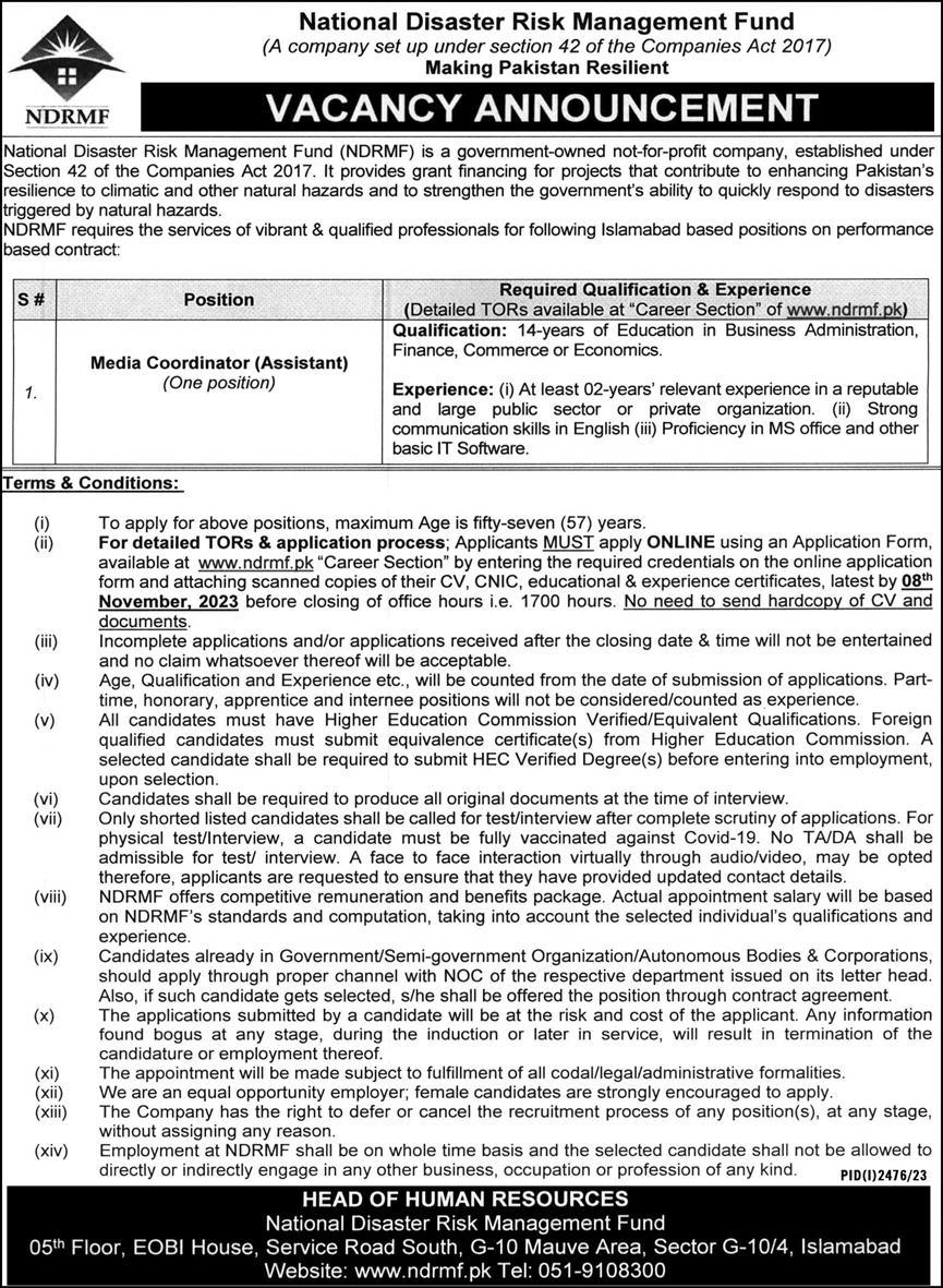 National Disaster Risk Management Fund NDRMF invites applications for job positions advertised in daily Express dated 25 October 2023 for following vacancies in Islamabad, islamabad Islamabad Pakistan.