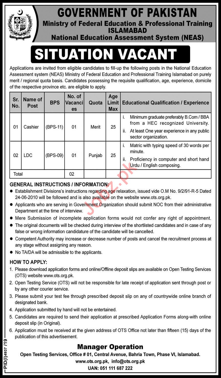 Ministry of Federal Education & Professional Training MOENT, National Education Assessment System NEAS invites applications from experienced, dynamic and qualified candidates against the posts of Cashier and LDC Lower Division Clerk in Islamabad through Open Testing Service OTS.
