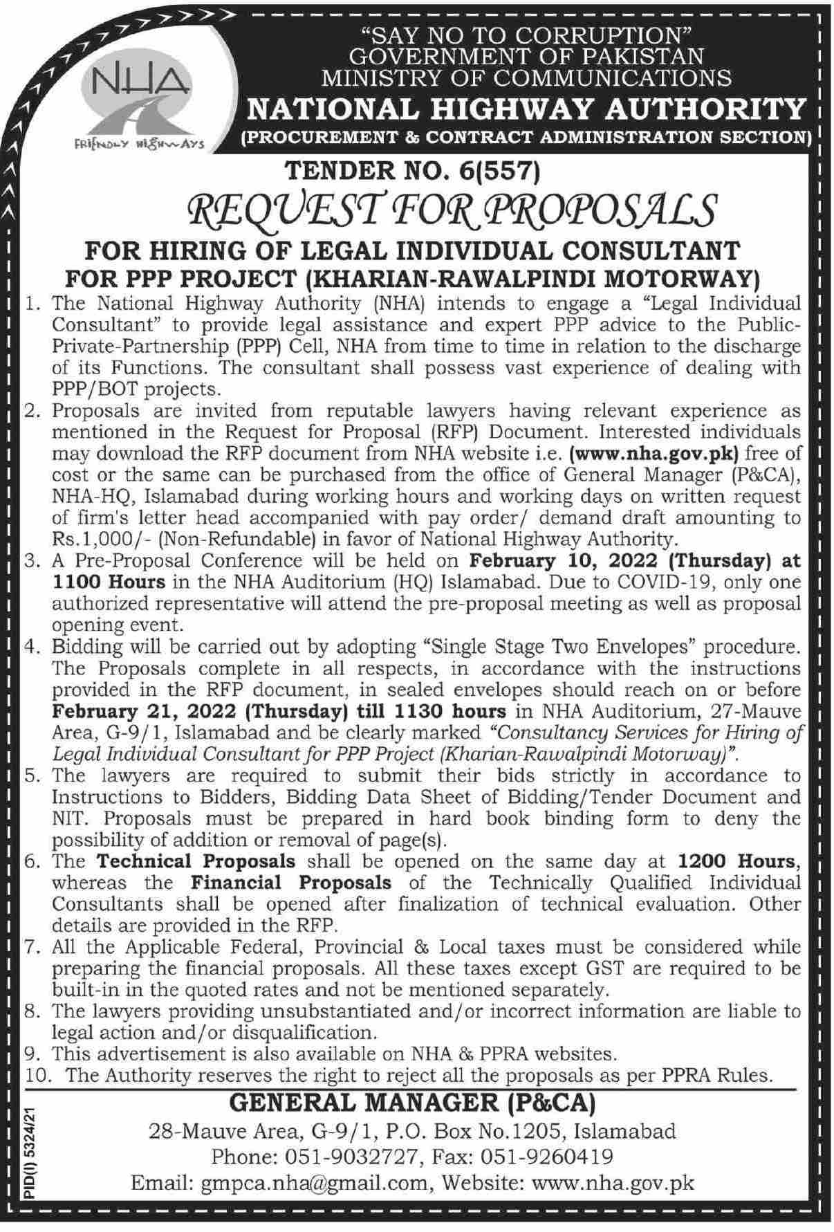 National Highway Authority NHA, Ministry of Communication invites applications for job positions advertised in daily Dawn dated 3 February 2022 for following vacancies in Islamabad Pakistan.