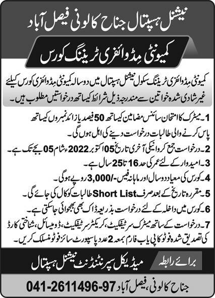 National Hospital Jinnah Colony Faisalabad admissions 2022 for Midwifery Course. has been announced. Students who want to take admissions in National Hospital Jinnah Colony Faisalabad Faisalabad Punjab Pakistan for academic year 2022 to continue education in Teaching Course can apply. Eligible candidates for admissions in Course can apply as per Private institute criteria and before closing date 5 October 2022 after reading advertisement online. Read newspaper ad for exact details.