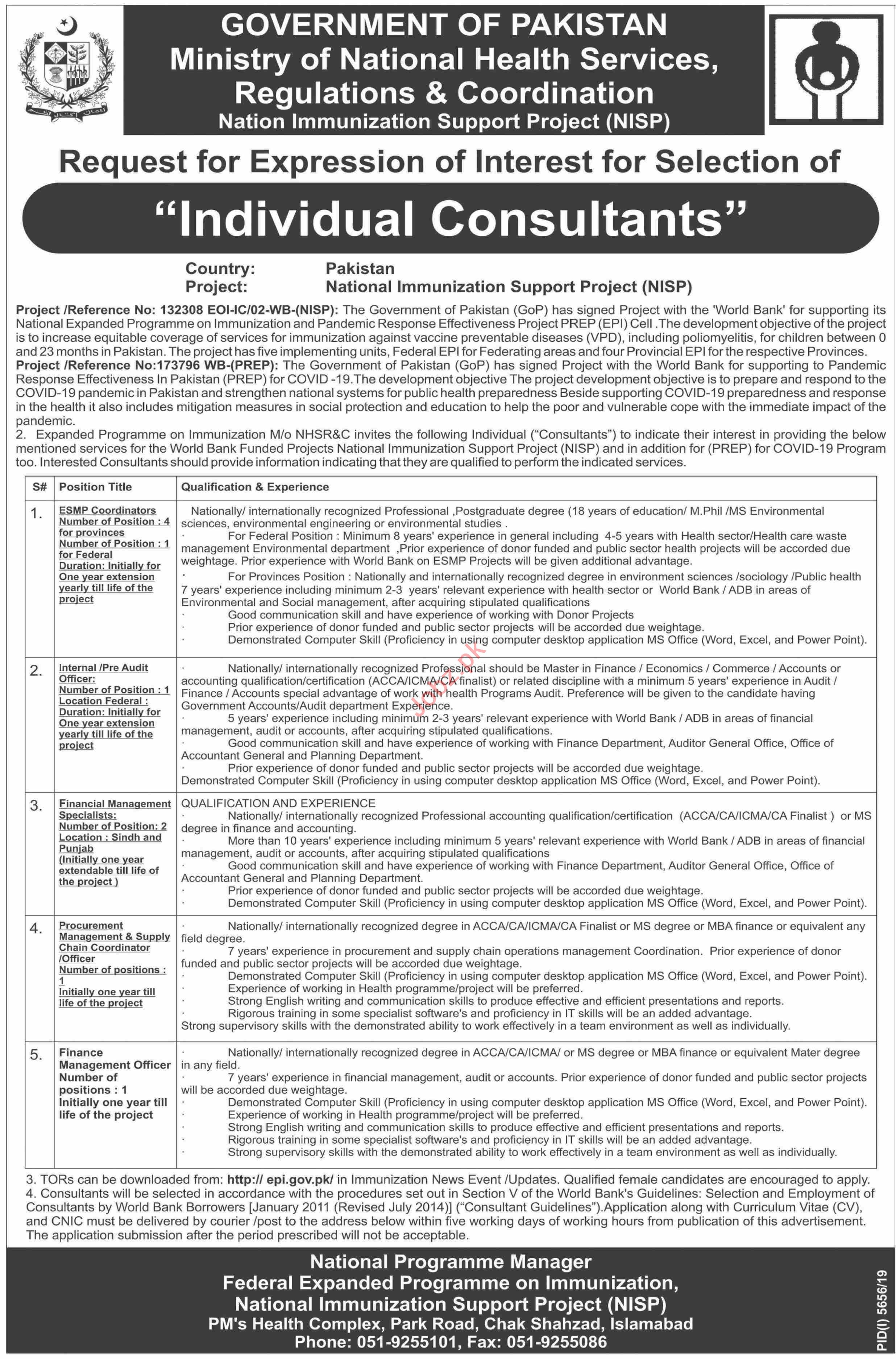 National Immunization Support Project NISP Islamabad, Pandemic Response Effectiveness Project PREP, Federal Expanded Programme on Immunization EPI, Ministry of National Health Services Regulations & Coordination NHSRC, Government of Pakistan are seeking candidates for the posts of ESMP Coordinator, Internal Auditor, Pre Audit Officer, Financial Management Specialist, Procurement Management Officer, Supply Chain Coordinator, Procurement Officer, Finance Management Officer.