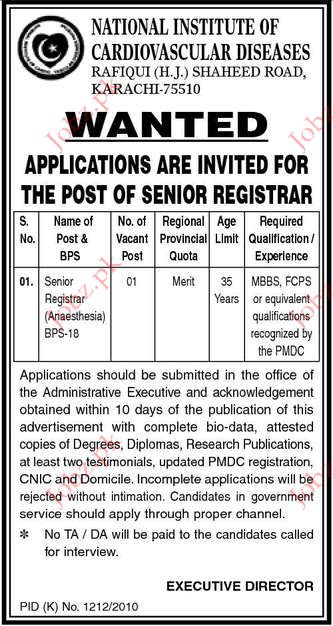 National Institute Of Cardiovascular Diseases Karachi Jobs