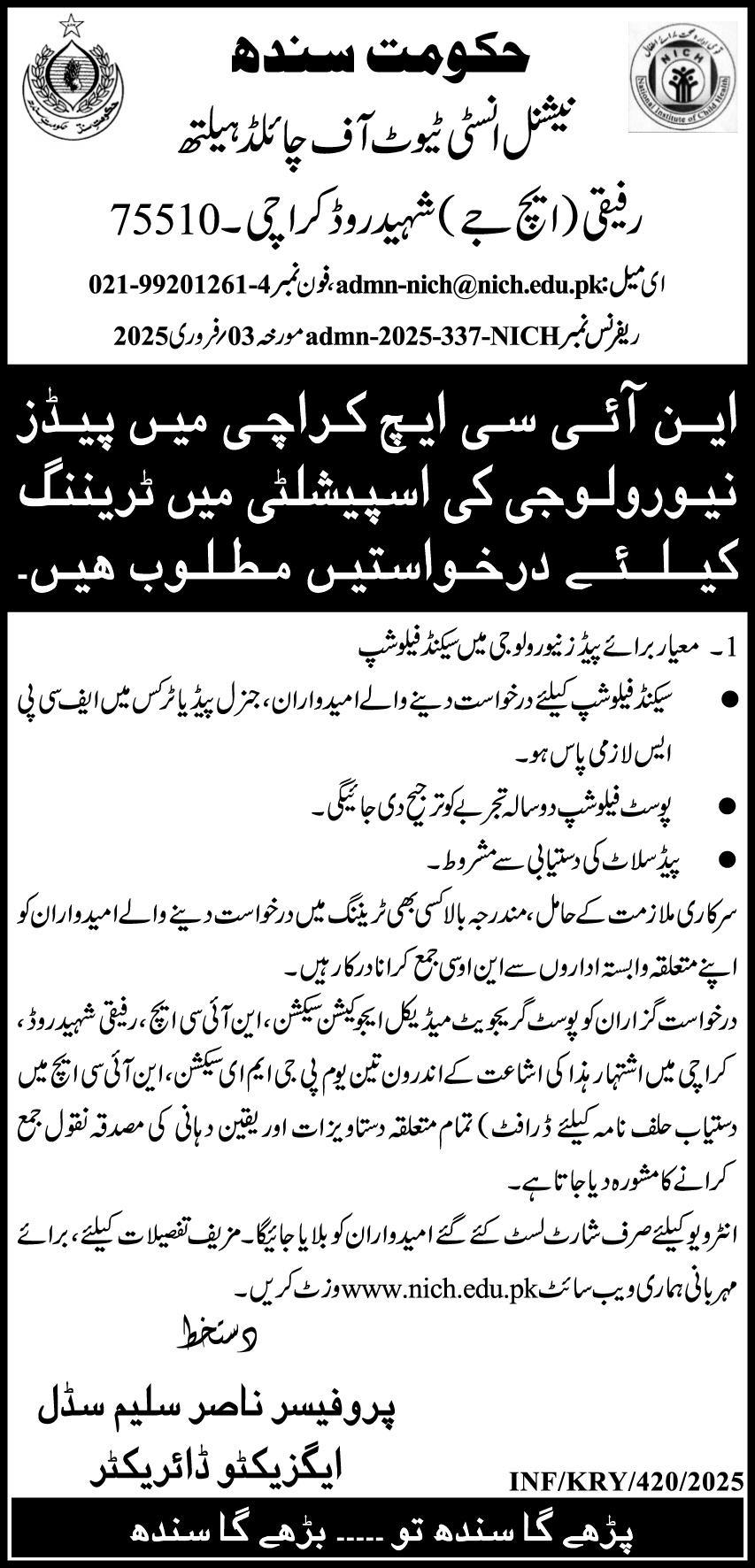 National Institute of Child Health jobs advertisement dated about 4 February 2025 in daily Express Newspaper invites application for the vacant post of paeds neurology fellowship and fellowship in Karachi, karachi Sindh Pakistan. Candidates with P.G Diploma, Others and MBBS etc. educational background will be preferred.