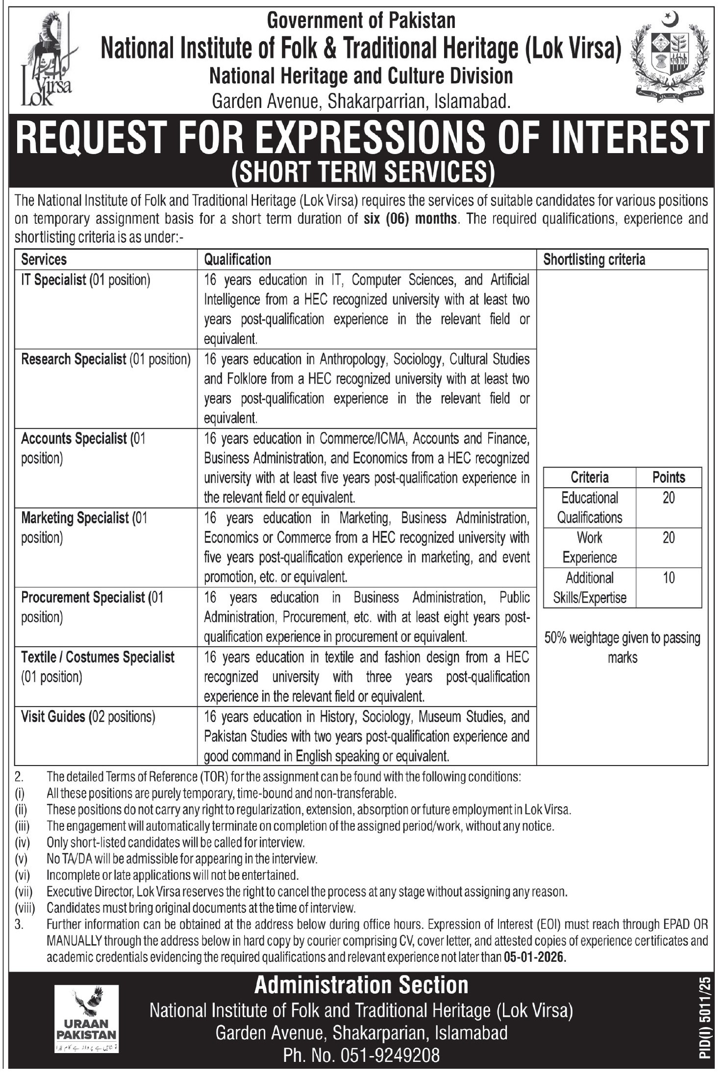Lok Virsa, National Heritage & Culture Division, National Institute of Folk & Traditional Heritage NIFTH Zero Point Islamabad, islamabad Islamabad Pakistan invites applications from eligible candidates for the post of research specialist, costumes specialist, textile specialist, marketing specialist, accounts specialist, visit guides, it specialist and procurement specialist as per advertisement of December 19, 2025 published in daily Express Tribune Newspaper. Educational qualifications required Master etc.