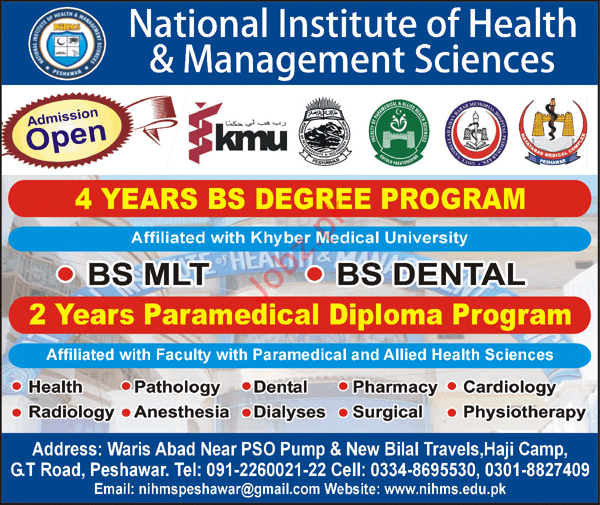 National Institute of Health & Management Sciences offers admissions in BS MLT, BS Dental, Paramedical Diploma in Health, Pathology, Dental, Pharmacy, Cardiology, Radiology, Anesthesia, Dialyses, Surgical, Physiotherapy in Peshawar. Read newspaper ad for exact details.