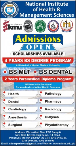 National Institute of Health & Management Sciences NIHMS is offering admissions for BS MLT, BS Dental, Paramedical Diploma Program in Health, Pathology, Dental, Pharmacy, Cardiology, Radiology, Anesthesia, Dialyses, Surgical and Physiotherapy. Read newspaper ad for exact details.